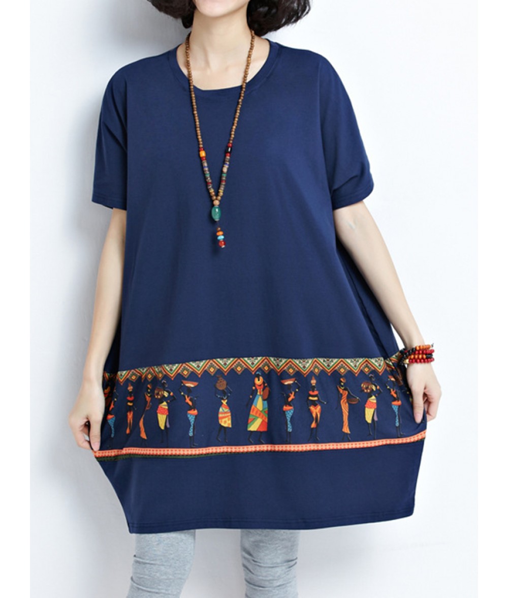 Ethnic Printed Loose O-neck Short Sleeve Women T-shirts
