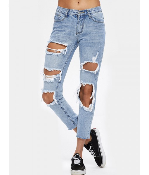 Casual Women Ripped Hole Mid Rise Cropped Jeans
