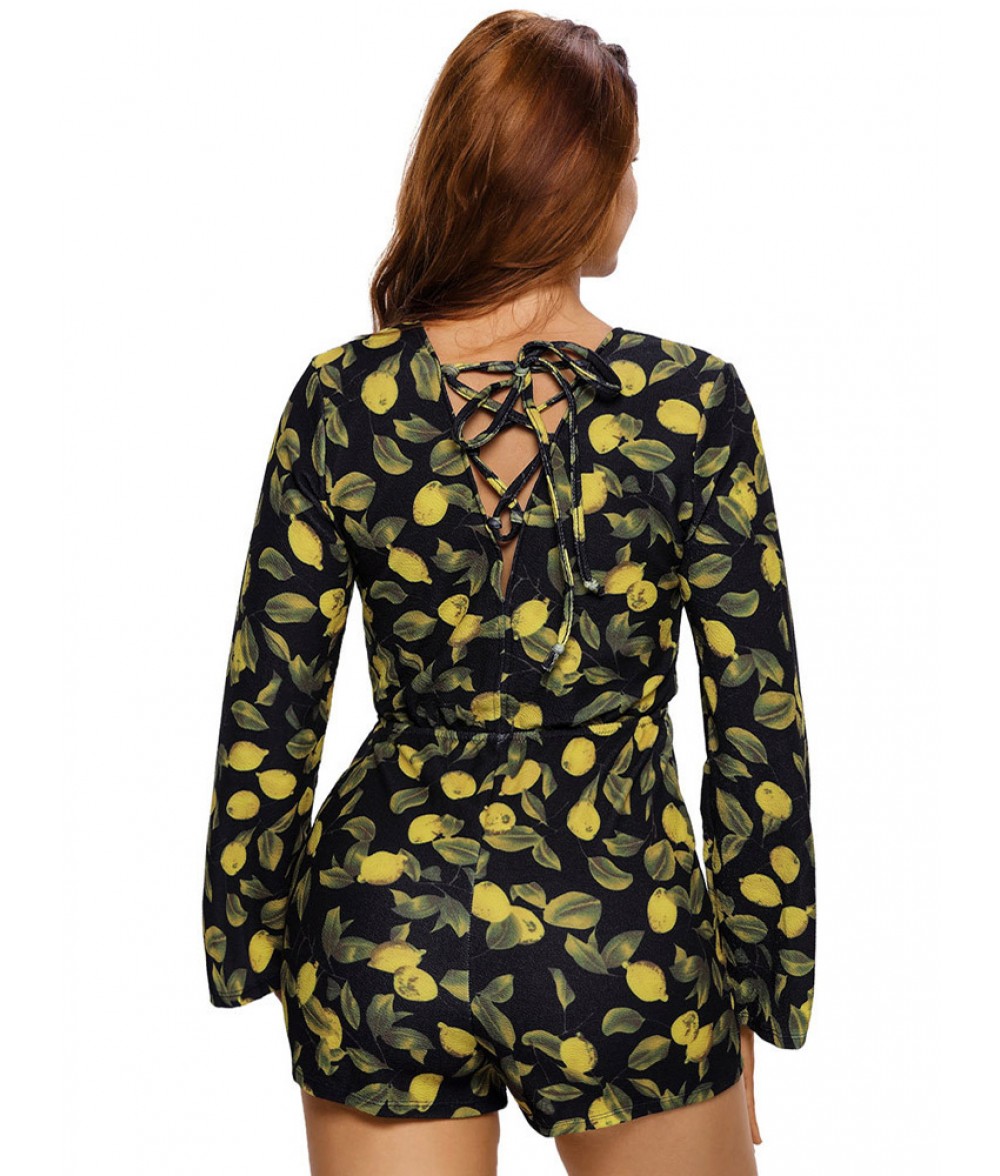 Sexy Women Geometric Printing Lacing V-Neck Long Sleeve Jumpsuit